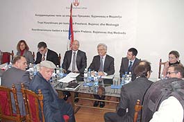 The session of the special working group was followd by by a press-conference that was given by Milan Markovic, President of the Coordination Body, Knut Vollebaek, OSCE High Commissioner on National Minorities, and Zoran Kostic, Assistant Minister of Education. Minister Markovic said that a decision to open a depeartment of the faculty of economics in Bujanovac was reached by consensus, adding that „deciding on all the issues was left to those who professionaly deal with establihment of national minorities, since we don’t want education to become a political topic.“