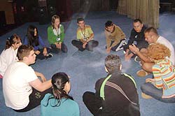 In order for parents to familiarize themselves with the project in which their children participate, a parents’ meeting was organized prior to one of the evening rehearsals. Blerim Hasani’s mother took Blerim’s one-year old sister to the meeting. During the meeting, young Erina crawled all over the room and laughed, and no workshop participant could help kissing her. Upon completion of the meeting, all those who wished to stay at the rehearsal could do so. That is what Dejan Jacimovic’s mother did, while Dejan was extremely good on the stage that evening. Since Dejan was perfect during the rehearsal, workshop managers played a joke on him by asking his mother to visit them as frequently as possible….