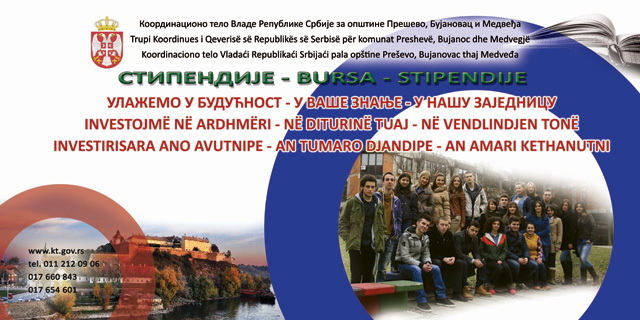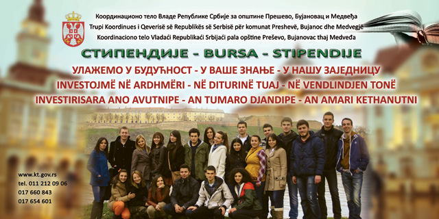 На основу Одлуке директорке Службе Координационог тела Владе Републике Србије за општине Прешево, Бујановац и Медвеђа 100 број: 670-00-00002/2015-01 од 15.05.2015. године, Служба Координационог тела објављује, Конкурс за доделу стипендија за упис на студије на факултетима Универзитета у Новом Саду и Универзитету у Београду, Филолошки факултет – катедра за албанологију.