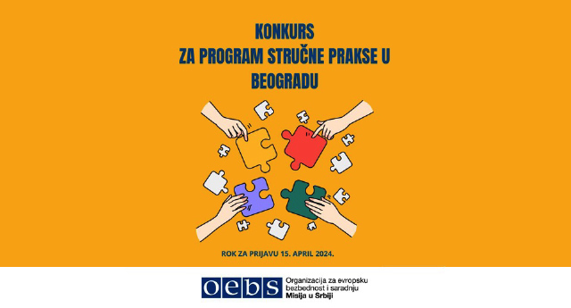 Мисија ОЕБС у Србији и Министарство за људска и мањинска права и друштвени дијалог Владе Републике Србије позивају све заинтересоване да се јаве на расписани јавни конкурс за пријем кандидата у Програм стручне праксе за 2024/2025. годину.