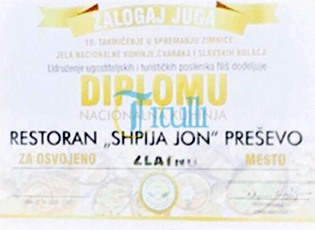 Preshevë – Restoran piceria “Shpija Jonë” në Preshevë, ka marrë vendin e parë dhe medaljen e artë në garën ndërkombëtare të gastronomisë në përgaditjen e ushqimeve të kuzhinës popullore “Kafshata e jugut” në Nish.
