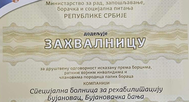 Специјална болница за рехабилитацију у Бујановачкој Бањи добила је захвалницу за друштвену одговорност исказану према борцима, ратним војним инвалидима и члановима породица палих бораца, јер је омогућила попусте за све оне који имају борачку картицу.